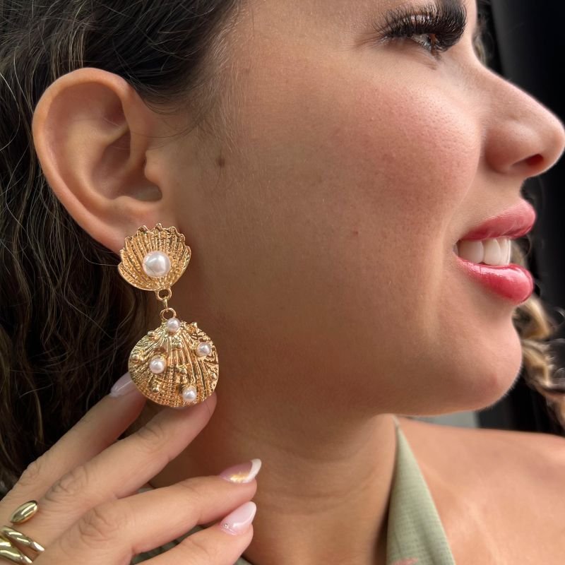 3. Brinco Concha C/ Pérola Biju Fina Dourado