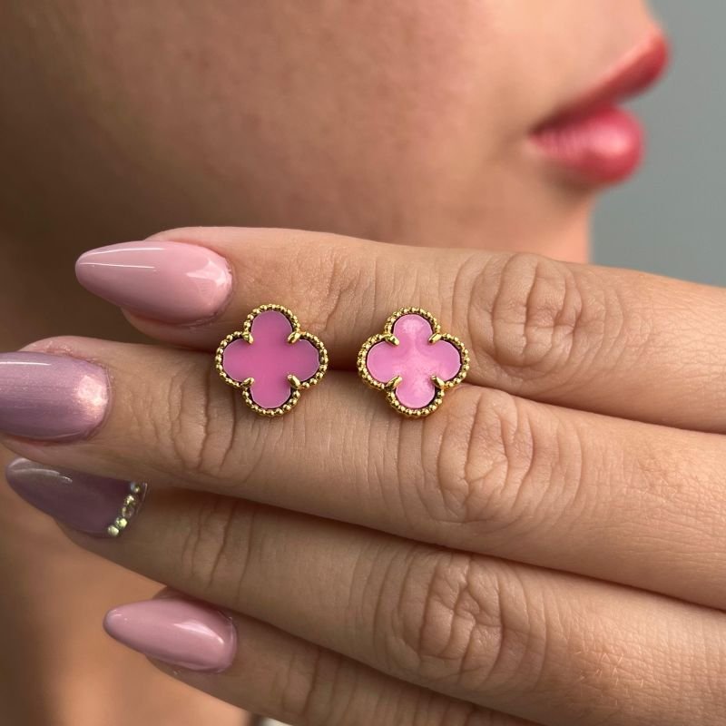 Brinco Trevo Rosa Resinado Banho Ouro 18k/Prata 925