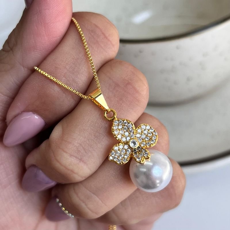Colar Flor C/ Perola Banho Ouro 18k