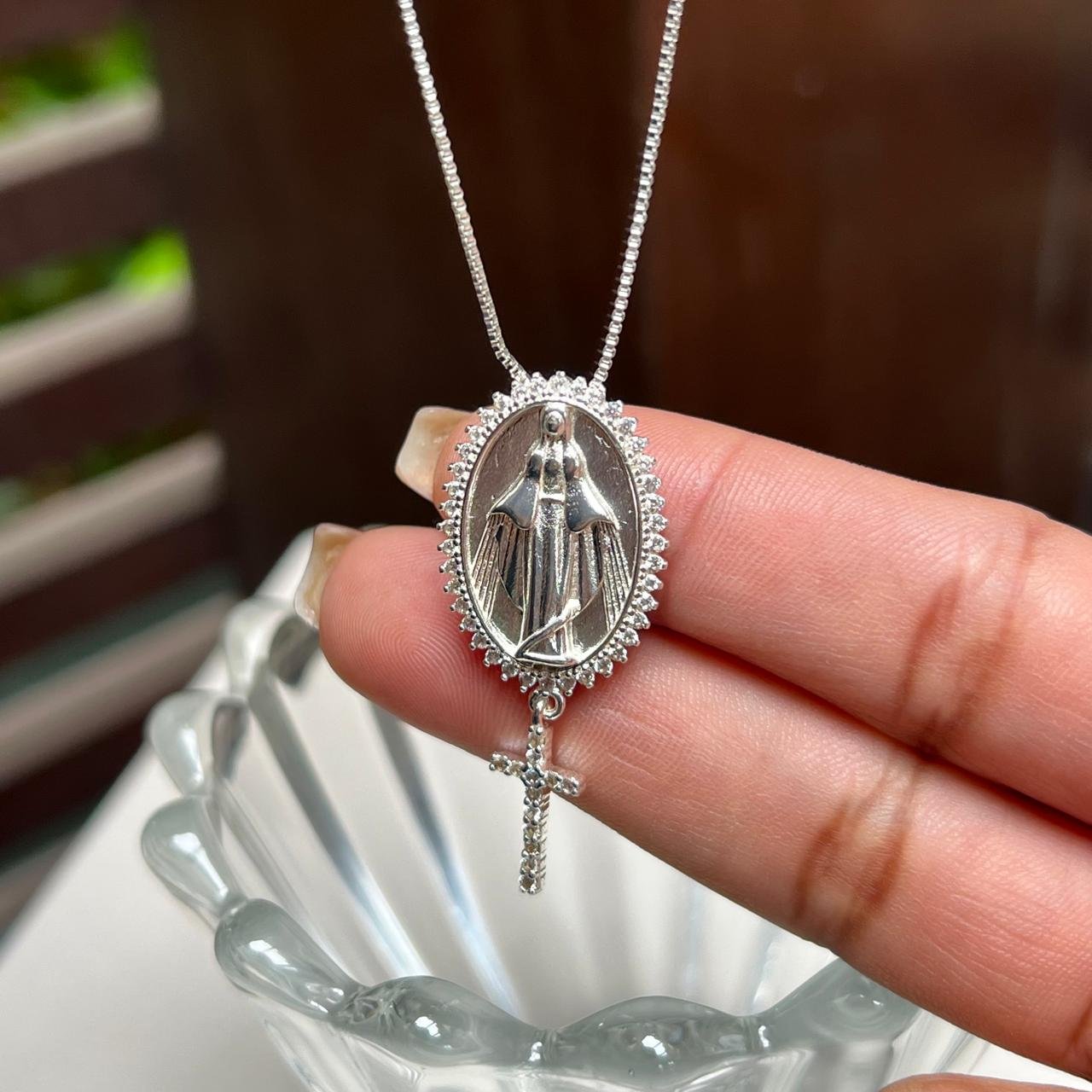 Colar Medalha Nossa Senhora C/ Crucifixo Banho Prata 925