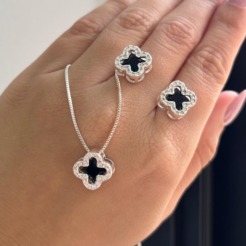 Conjunto Colar + Brinco Trevo Cravejado Banho Ouro 18k/Prata 925