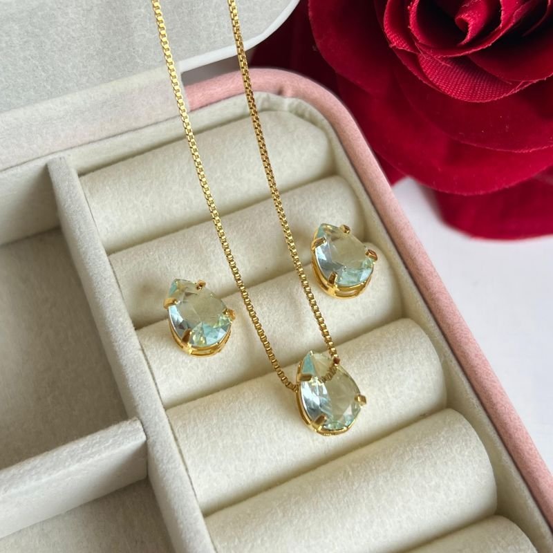 Conjunto Gota Azul Tiffany Banho Ouro 18k/Prata 925