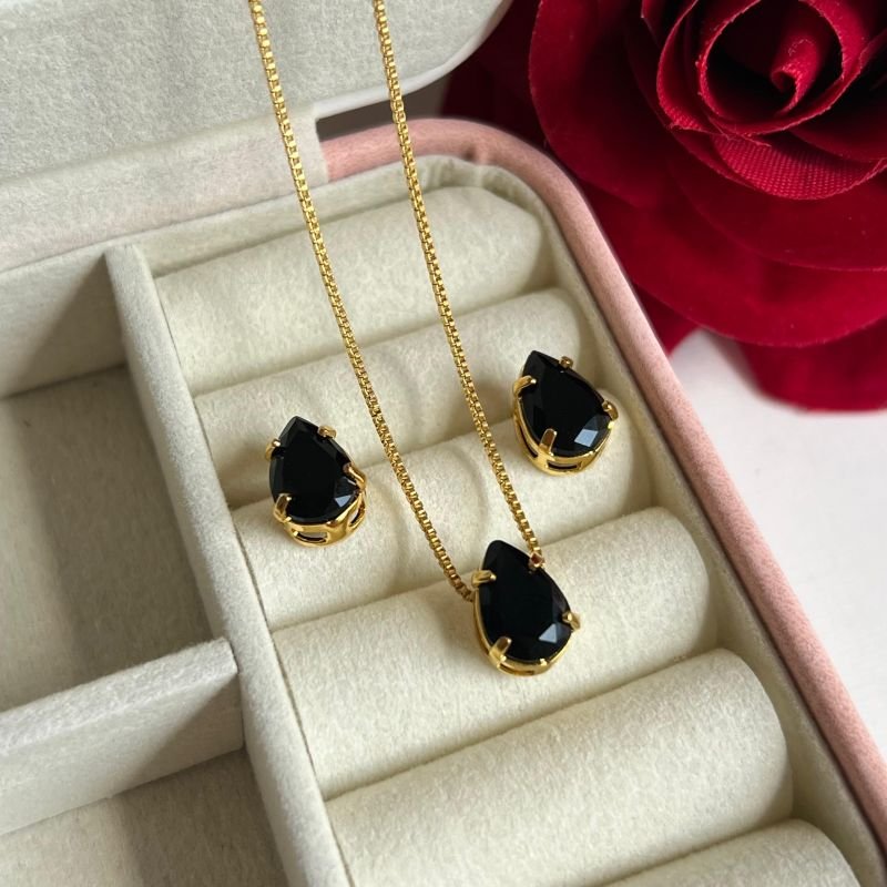 Conjunto Gota Preta Banho Ouro 18k/Prata 925