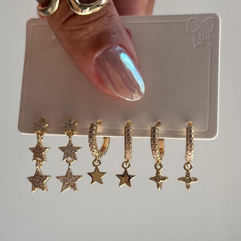 3. Kit de Brinco Três Estrelas Cravejado Biju Fina Dourado/Ródio