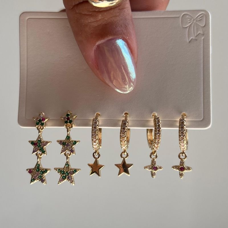 Kit de Brinco Três Estrelas Multicolor Cravejada Biju Fina Dourado/Ródio