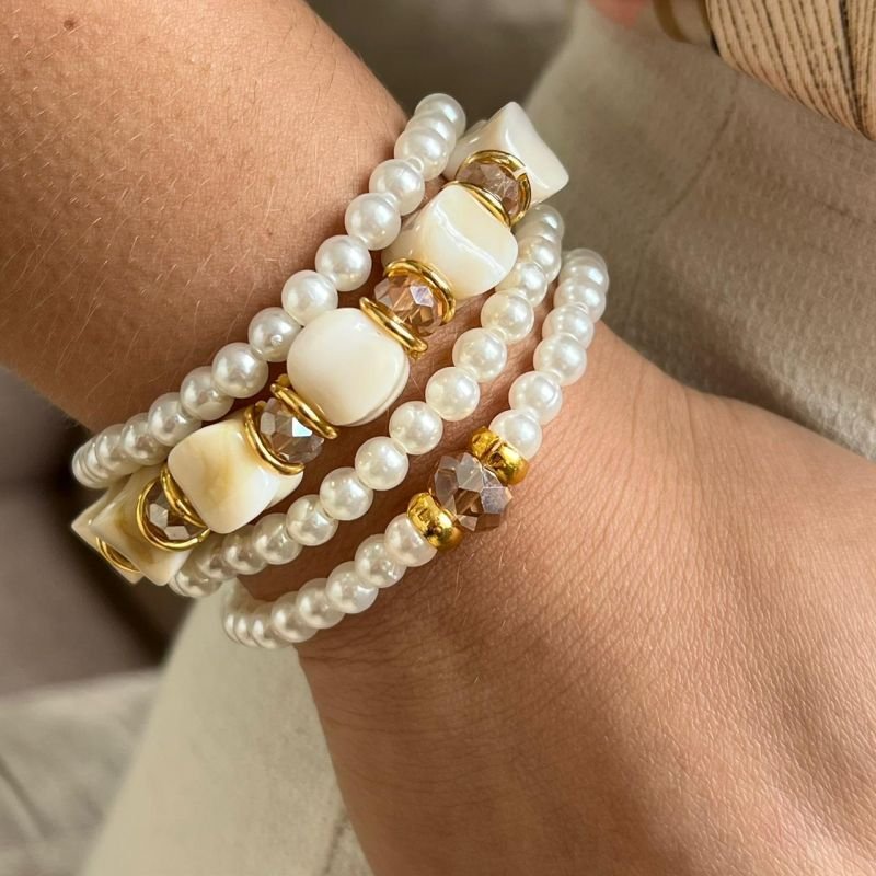 Mix De Pulseiras Artesanal C/ Cristal Linha BIju Fina Pérola Com Bege