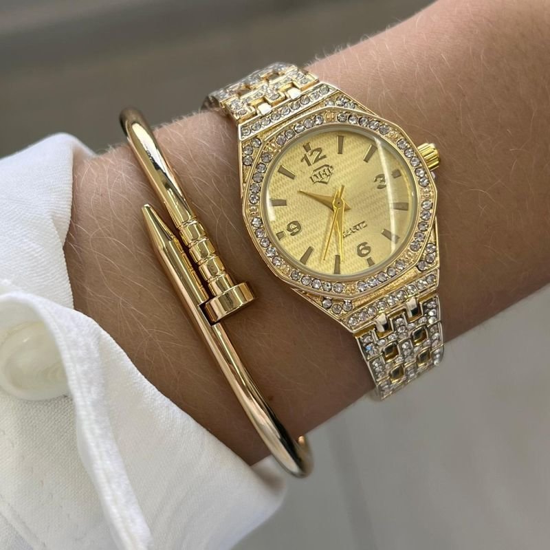 Relógio Feminino Cravejado Dourado c/ Dourado Linha Premium