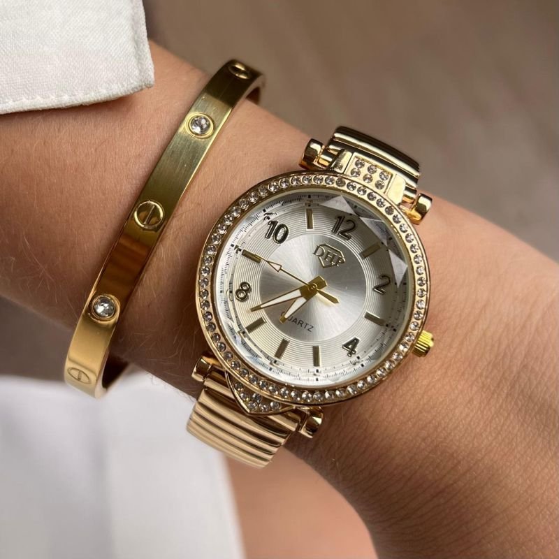Relógio Feminino Pulseira Elástica Dourado c/ Fundo Branco Linha Premium