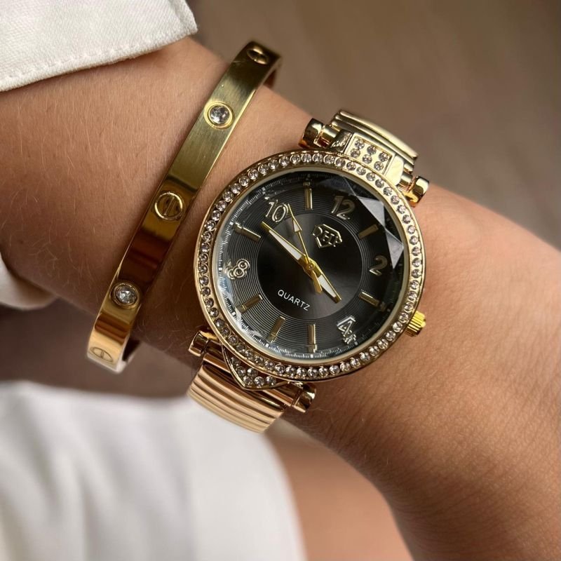 Relógio Feminino Pulseira Elástica Dourado c/ Fundo Preto Linha Premium