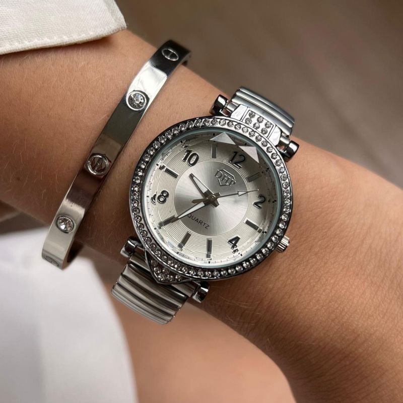 Relógio Feminino Pulseira Elástica Ródio c/ Fundo Branco Linha Premium