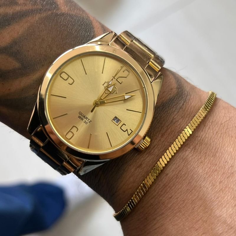 Relógio Masculino c/Calendário Dourado Fundo Dourado Linha Premium